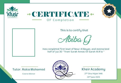 For committed students who complete their memorization or reach advanced proficiency in recitation, we offer the opportunity to obtain an official Ijāzah (certification) with a connected Sanad (chain) back to the Prophet ﷺ through qualified Azhari teachers.